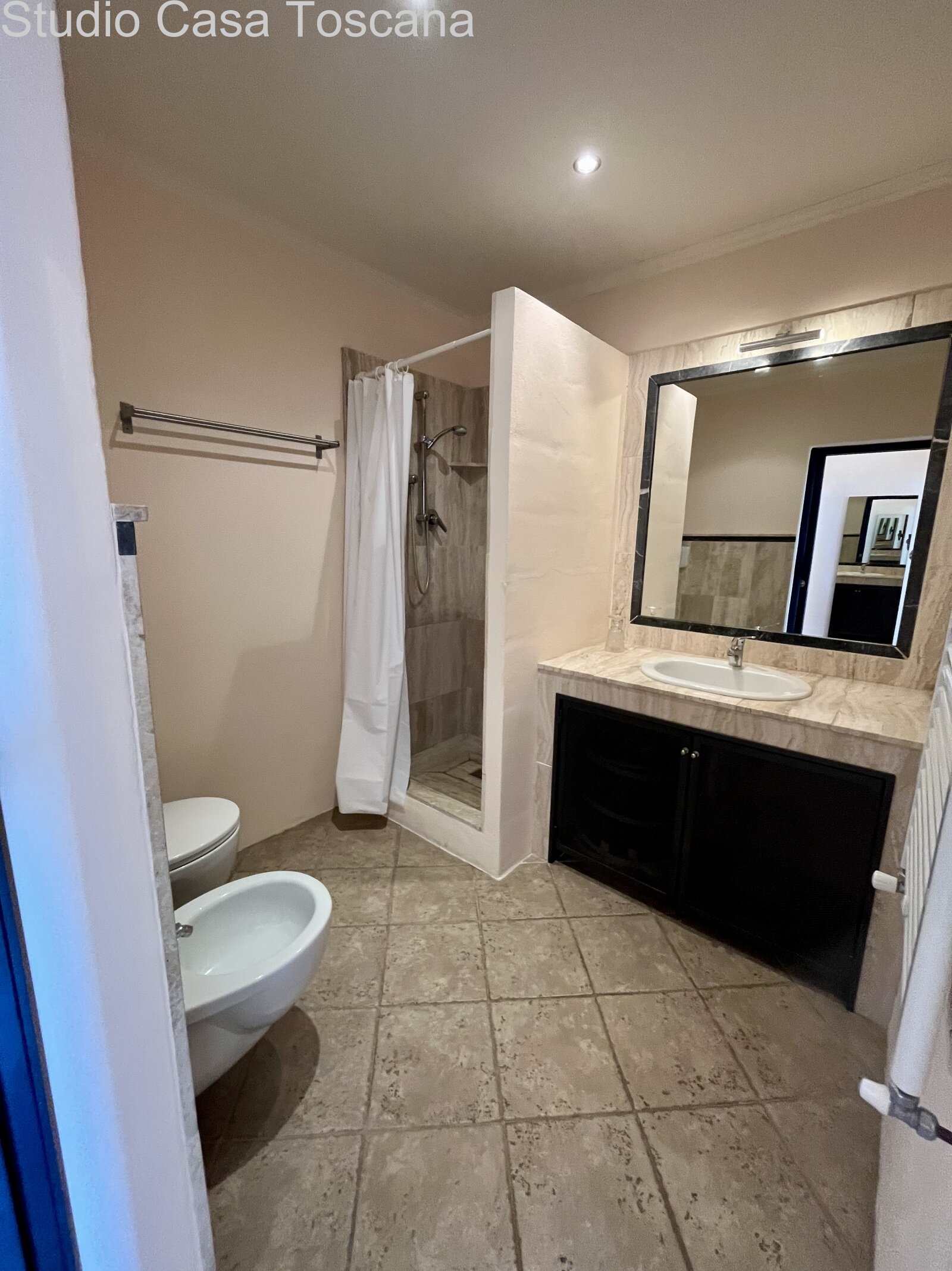 The apartment consists of a large living room with a masonry kitchen and direct access to the panoramic loggia, two bedrooms, and two bathrooms. The interiors are enhanced by elegant finishes and high-quality materials, with travertine floors and wall coverings, also present in the bathrooms, shower areas, and kitchen, giving the home a refined and typically Tuscan style.