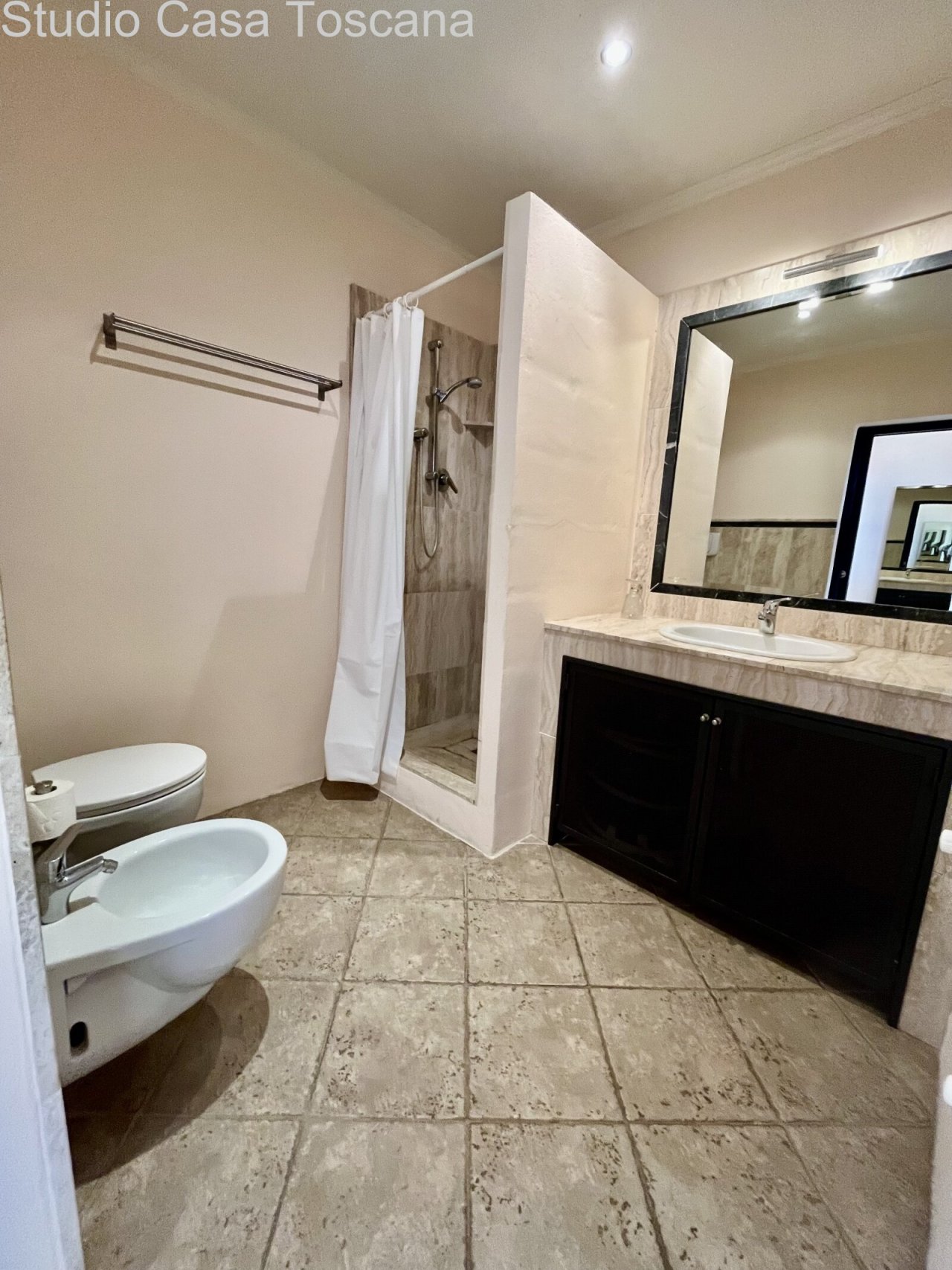 Die Wohnung besteht aus einem großzügigen Wohnzimmer mit gemauerter Küche und direktem Zugang zur Panorama-Loggia, zwei Schlafzimmern und zwei Badezimmern. Die Innenräume werden durch hochwertige und elegante Materialien aufgewertet: Böden und Wandverkleidungen sind aus edlem Travertin, der auch in den Badezimmern, im Duschbereich sowie in der Küche verwendet wurde und dem Haus einen raffinierten, typisch toskanischen Stil verleiht.…