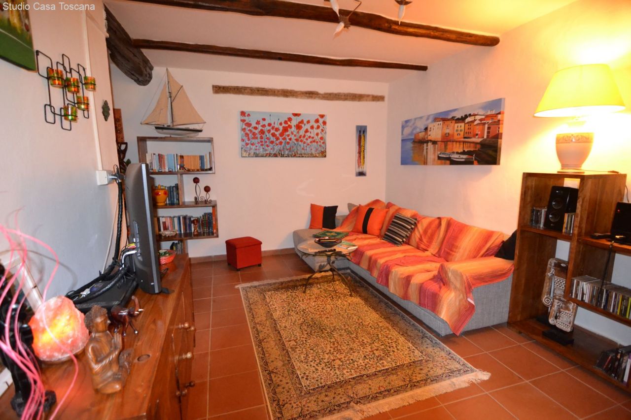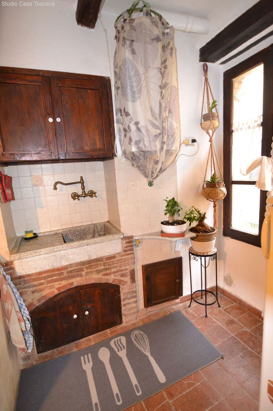 Ingesso al piano strada, al piano primo si trova la cucina con elementi tradizionali Toscani in muratura, al piano secondo la sala e al ultimo piano la camera, il bagno e una cabina armadio.