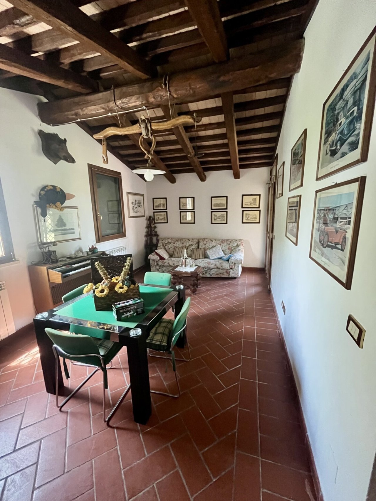 Questa abitazione si contraddistingue per uno stile più tradizionale toscano: travi in legno a vista, pavimenti in terracotta trattati, cucina in muratura, un grande camino nel soggiorno e arredi in legno massello.