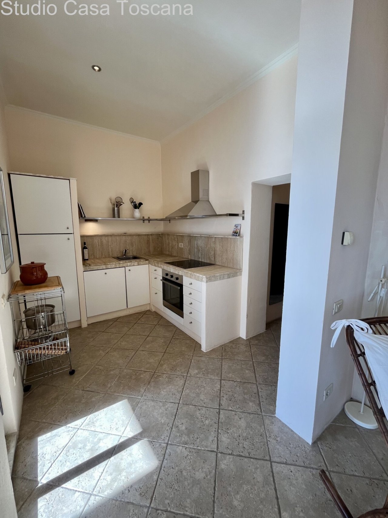 The apartment consists of a large living room with a masonry kitchen and direct access to the panoramic loggia, two bedrooms, and two bathrooms. The interiors are enhanced by elegant finishes and high-quality materials, with travertine floors and wall coverings, also present in the bathrooms, shower areas, and kitchen, giving the home a refined and typically Tuscan style.