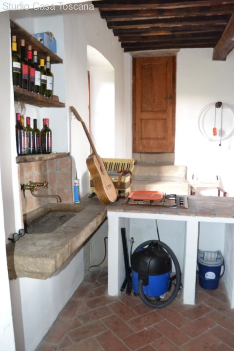 The country house is about 200 square meters and is on three floors. Currently, the ground floor is used as storage space, while there is a kitchen with dining room and living room and 2 bedrooms on the first floor. On the second floor there is a spacious attic. In front of the house there is a large terrace. The house requires restoration.